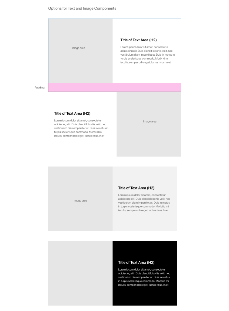 If you have component – section usually row of the page that has text and an image, you could come up with options below as requirements for the component design flexibility.